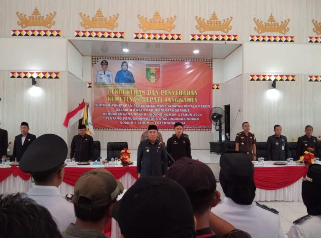 TKN94.COM-Berdasarkan Undang – Undang Nomor 3 (tiga) tahun 2024 tentang perubahan kedua atas undang – undang nomor 6 tahun 2014 tentang desa. Pj Bupati Kabupaten Tanggamus Dr. Ir. Mulyadi Irsan,. M.T. mengukuhkan dan menyerahkan Keputusan Bupati Tanggamus kepada 229 Kepala Desa/Pekon, Kamis (04/07/2024).