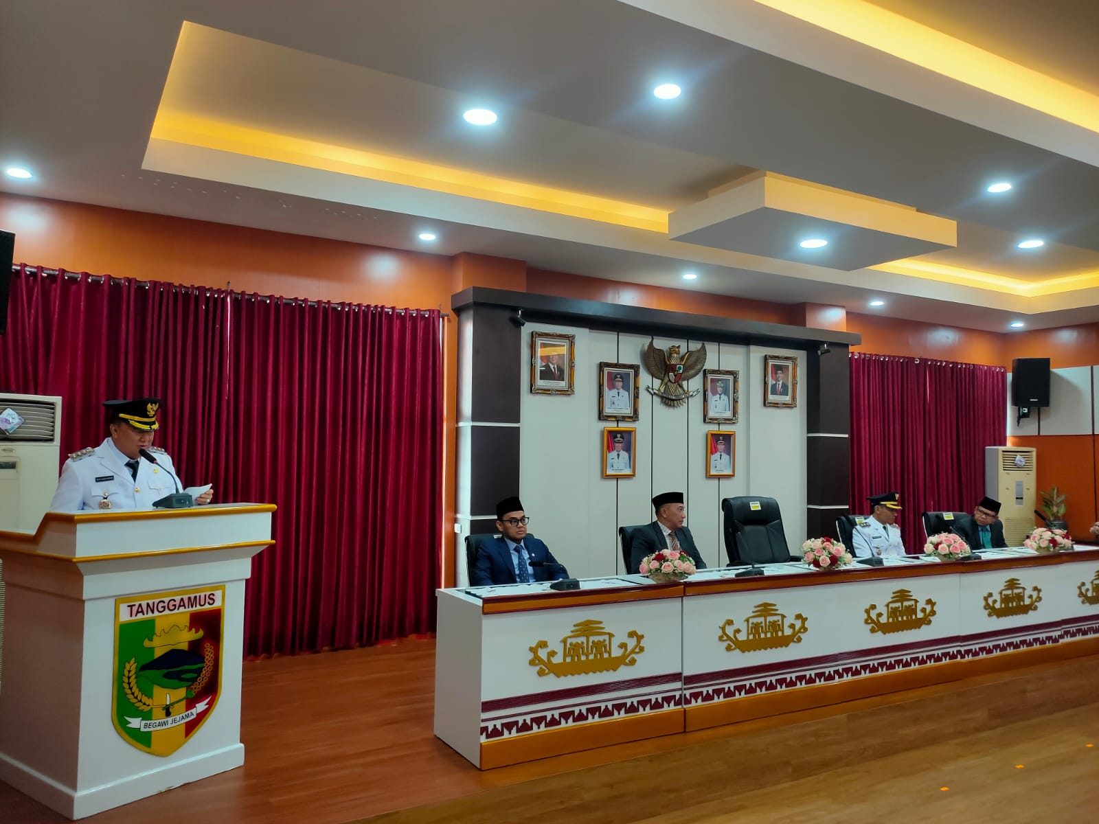 Hadir Pj. Bupati Tanggamus beserta ibu, Gubernur Lampung yang diwakili oleh Asisten III Administrasi Umum , Wakil Bupati Tanggamus, beserta ibu, Pimpinan DPRD Kabupaten Tanggamus, Para Anggota FORKOPIMDA Kab. Tanggamus, Sekretaris Daerah, Para Asisten dan Staf Ahli Bupati, Para Kepala Perangkat Daerah lingkungan Pemerintah Kabupaten Tanggamus, Para Pimpinan Instansi Vertikal dan Camat seKabupaten Tanggamus, Ketua KPU dan Bawaslu Kabupaten Tanggamus, Ketua Tim Penggerak PKK Kabupaten Tanggamus, Ketua Dharma Wanita Persatuan Kab. Tanggamus serta Ketua dan Pengurus APDESI Kab. Tanggamus