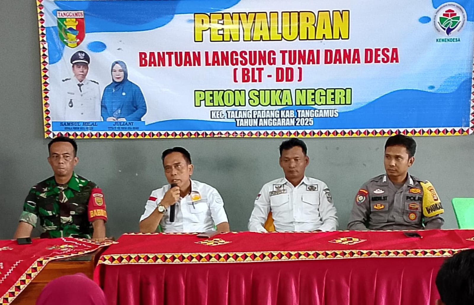 TKN94.COM,Talang Padang,(HGN) – Babinkamtibmas Polsek Talang Padang polres Tanggamus Bripka Andri Setiawan Melaksanakan Monitoring kegiatan pelaksanaan Penyaluran BLT-DD tahap pertama tahun 2025, bertempat di balai Pekon Suka Negri, Rabu 19 Maret 2025.