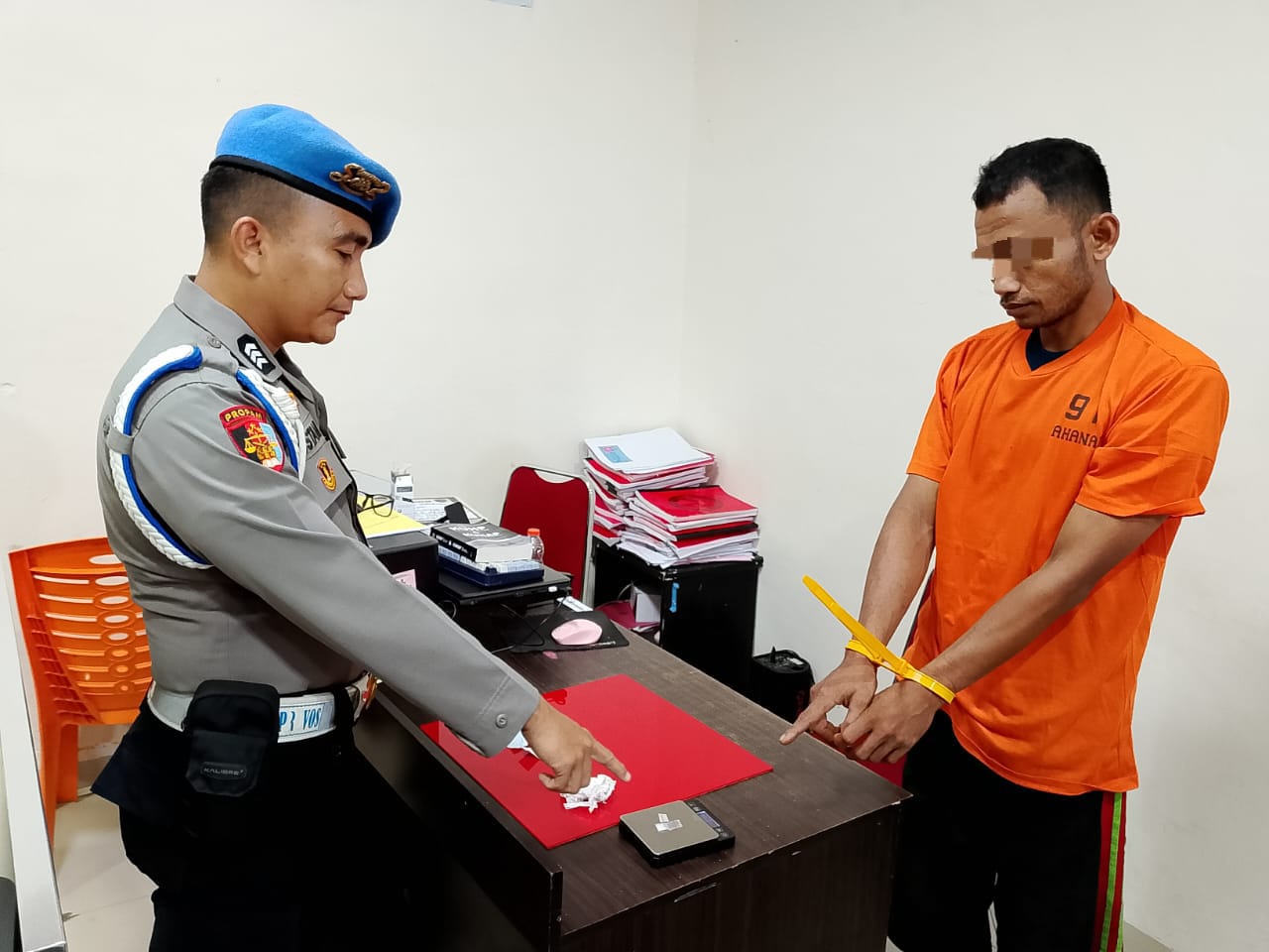 Dari tangan tersangka, petugas mengamankan barang bukti berupa dua paket narkotika jenis sabu dengan berat kotor 0,36 gram yang dibungkus plastik klip bening, dua lembar kertas putih, satu lembar tisu, satu buah mancis tanpa penutup kepala, serta satu unit sepeda motor merek Honda tanpa nomor polisi dan tanpa body motor.