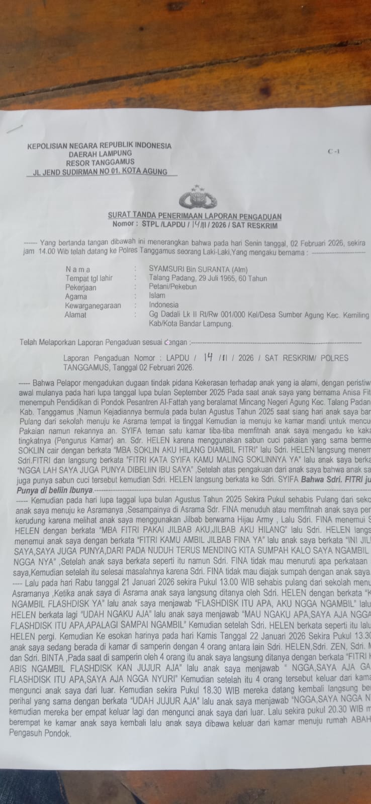 Targetkasusnews.com | Tanggamus, Lampung — Keluarga santriwati berinisial F resmi melaporkan dugaan tindak perundungan yang dialami korban di salah satu pondok pesantren di Kecamatan Talang Padang, Kabupaten Tanggamus, ke Polres Tanggamus.