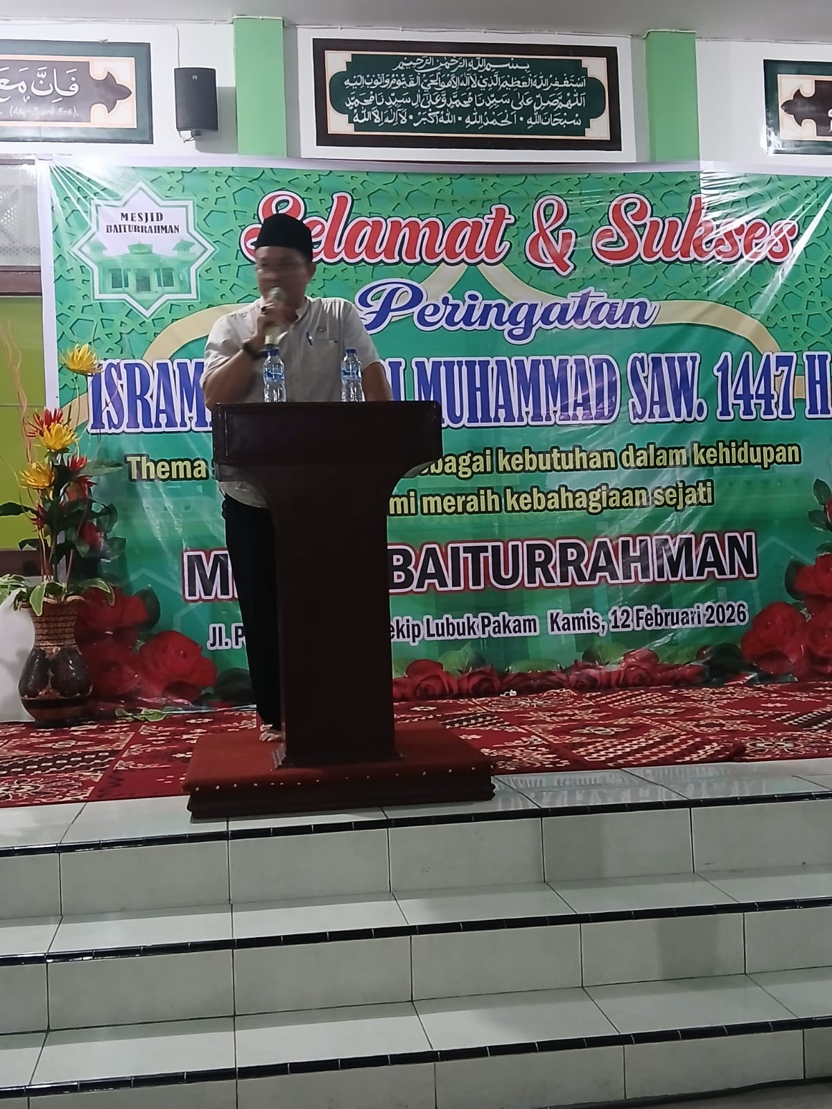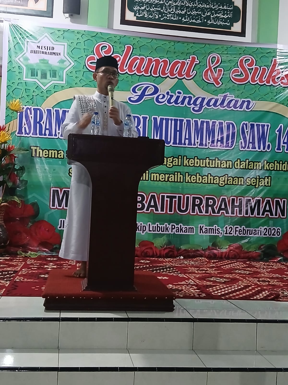 Sementara Ketua BKM Pantas Tarigan M.Si mengucapkan selamat datang kepada Tamu undangan serta masyakat sekitar lubuk pakam di masjid Baiturrahman ini guna memperingati Isra Mikraj Nabi Muhamaad S.A.W 1447 H.